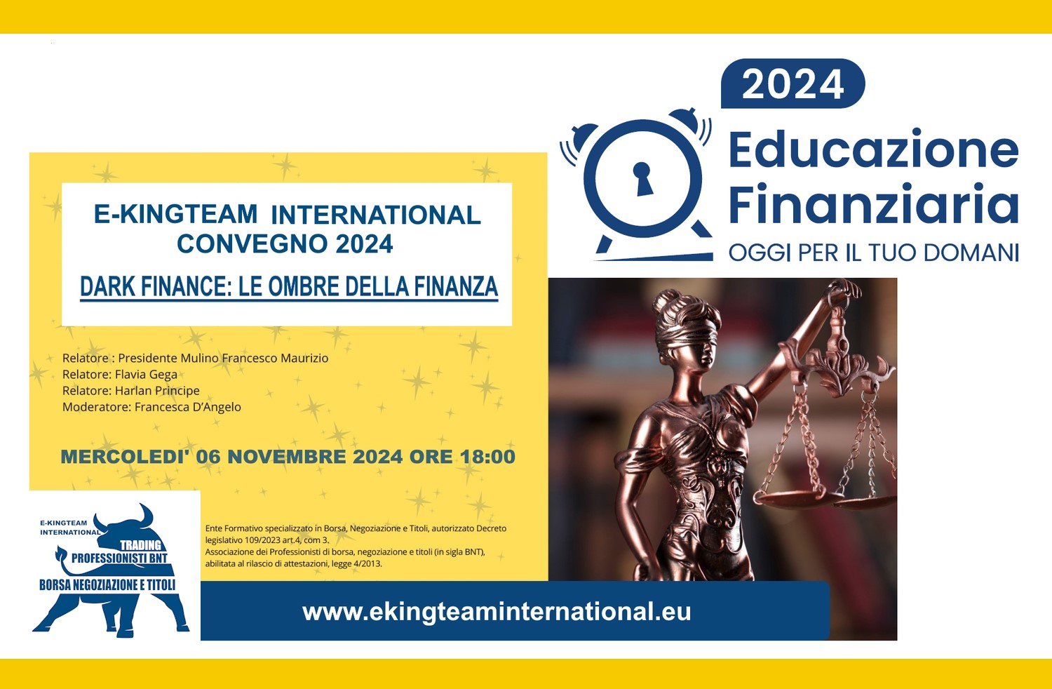 Durante il Convegno 2024 tenuto da E-Kingteam International e nel mese dedicato all’Educazione finanziaria, con l’approvazione del Comitato Edufin, i docenti del settore hanno approfondito “il lato oscuro della finanza” Dark finance: